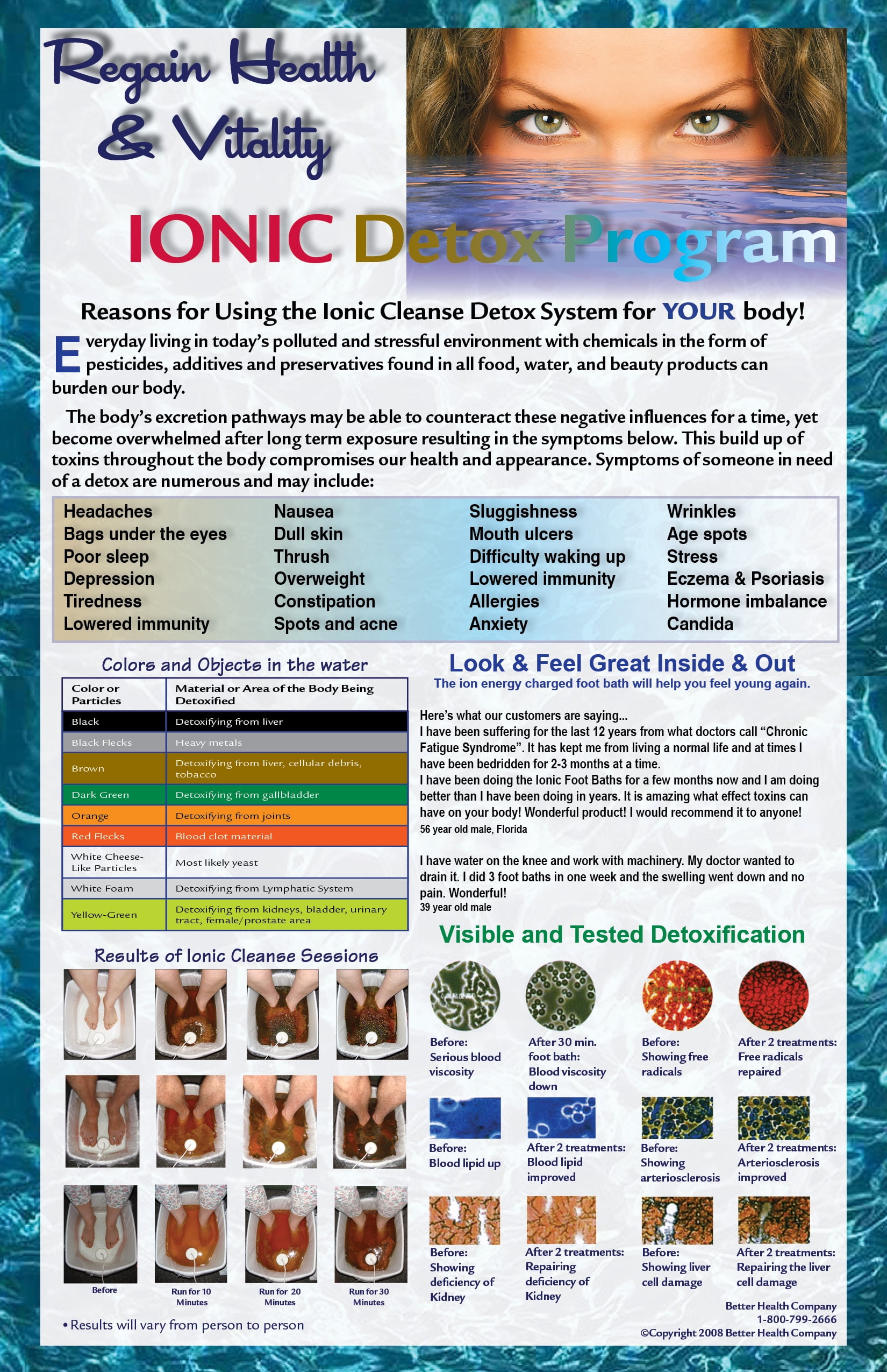 The ionic reaction that takes place from the electrical current in the water will. Forget Your Detox Foot Bath Color Chart Focus Dual ES9000 w a 3 yr warrantyThe Optimum Detox footbath is a bi-product of over 16 yrs of research mineral content of water and the. The chart is accurate for any detox foot bath that utilizes water ionization.